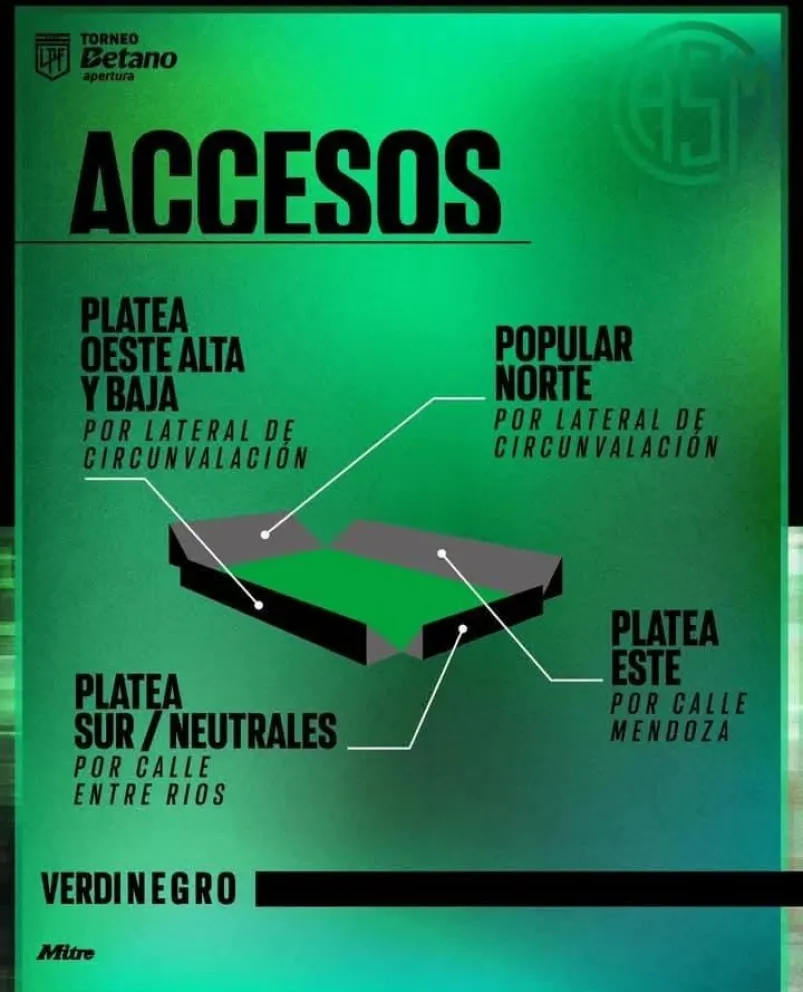 A través de sus redes sociales, el club Verdinegro confirmó que las puertas del estadio se abrirán a las 18:00 horas, y publicó un mapa con la distribución de accesos para los hinchas locales y los espectadores neutrales.