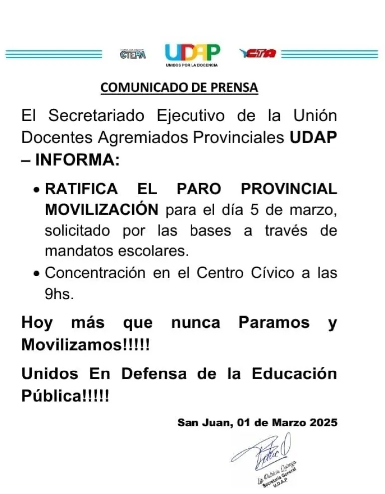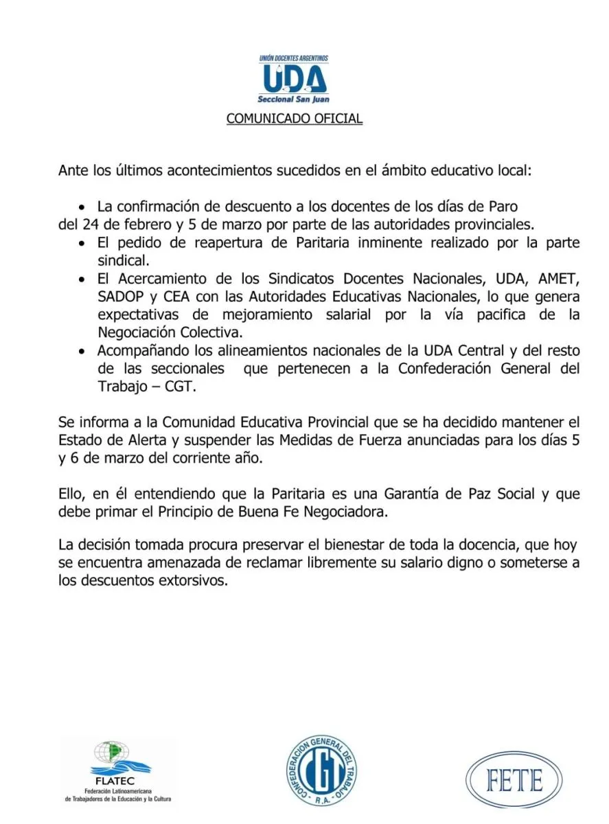 Es por eso que informaron a toda la comunidad educativa provincial y afiliados del gremio que desde UDA decidieron mantener el estado de alerta, pero suspenderá las medidas de fuerza anunciadas para el miércoles 5 y el jueves 6 de marzo, en la próxima semana.