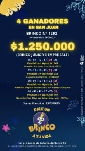 Finalmente, el cuarto ganador realizó su jugada en la Agencia 797 de Capital (25 de Mayo y Jujuy), también con los números 05, 07, 12, 17 y 23. El sorteo del Brinco Junior Siempre Sale, en el que estos sanjuaninos se consagraron como ganadores, tiene un plazo hasta el 25 de marzo del corriente año para que los premios sean reclamados.