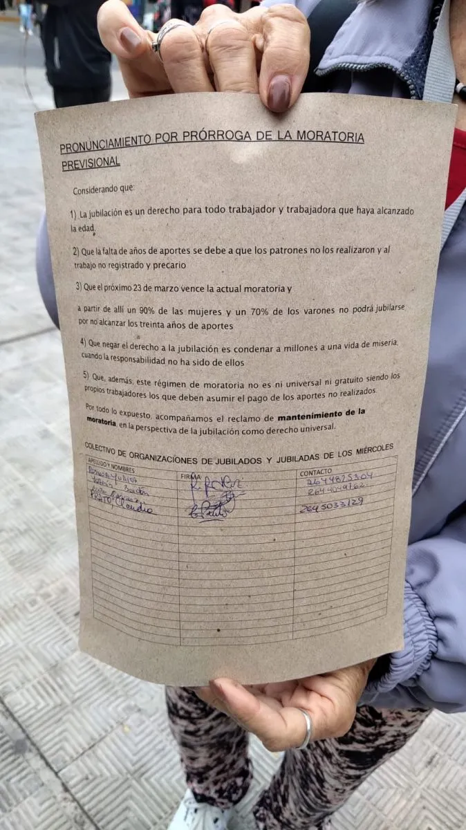 Este miércoles, a partir de las 10 horas, un grupo de jubilados pertenecientes a la Izquierda se reunió en San Juan para recolectar firmas en apoyo a un petitorio que rechaza la eliminación de la moratoria previsional dispuesta por el Gobierno nacional. La medida impide que personas sin los 30 años de aportes requeridos puedan acceder a una jubilación.