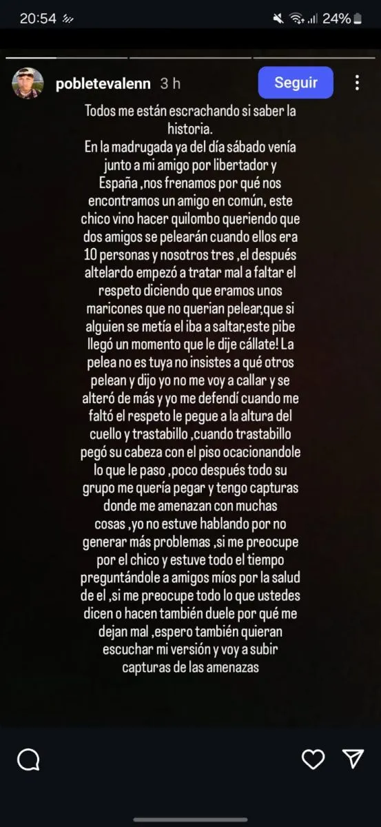 Descargo en redes sociales del joven de 23 años, señalado como el agreso del deportista.