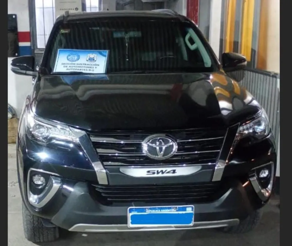 En uno de los allanamientos, en el departamento Santa Lucía, se recuperó una costosa camioneta Toyota SW4 de color negro (foto abajo), quien estaba siendo guiada por una mujer de 33 años, quien presentó documentación del rodado que no coincidió con la información registrada en el sistema digital. Por ello, se procedió al secuestro de la camioneta.
