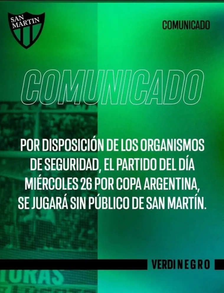 El enfrentamiento entre San Martín de San Juan y Gimnasia de Jujuy, correspondiente a la Copa Argentina, se jugará sin público sanjuanino. Así lo informó el club a través de un comunicado oficial, en el que se detalló que la decisión fue tomada por los organismos de seguridad.