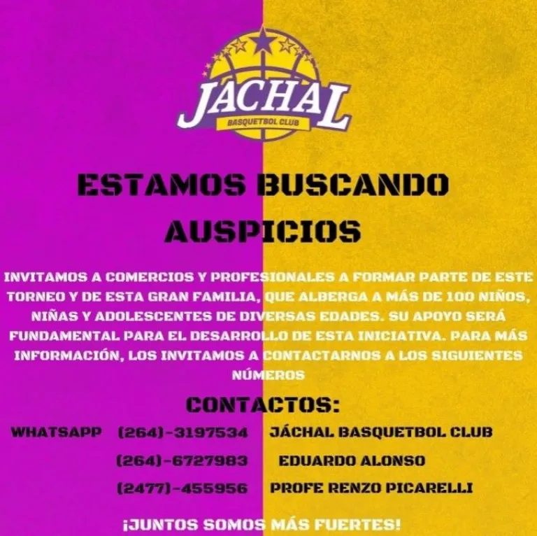 "Queremos invitarlos a acompañarnos en este gran desafío: enfrentar un nuevo campeonato de la Federación Sanjuanina de Básquet. Su apoyo es fundamental para que juntos logremos que muchos niños, niñas y jóvenes de nuestro departamento no solo defiendan con orgullo nuestros colores, sino también para seguir fomentando la actividad física, el respeto y la formación de ciudadanos de bien, valores que son el pilar de nuestra institución", remarca el comunicado, que agrega tres celulares como para contactarse para brindar ayuda al club, que cuenta con su sede el Estadio Papa Francisco, con capacidad 2.000 espectadores.