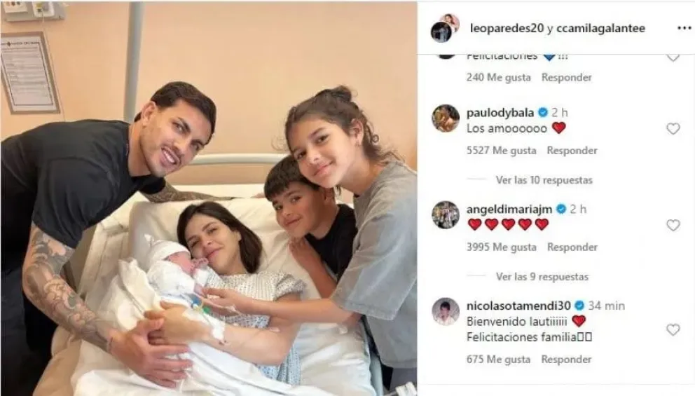 “¡Bienvenido, amorcito! Lautaro Paredes 31/03/2025”, describe la foto que publicaron esta mañana en presentación del nuevo integrante. Los comentarios y felicitaciones no tardaron en llegar. Entre ellos, compañeros de la Selección Argentina como Nicolás Otamendi, Ángel Di María, Giovanni Lo Celso y Paulo Dybala (también dupla en la Roma). Además, otros personajes como Juan Pablo Sorín, Jorgelina Cardoso (pareja del Fideo), Oriana Sabatini, Diego Schwartzman, Catherine Fulop, Erik Lamela, entre otros, no dudaron en dejar sus cumplidos.