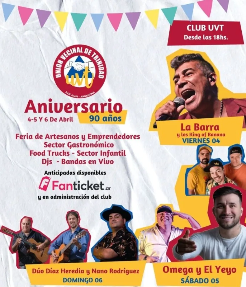 La Unión Vecinal de Trinidad celebrará sus 90 años con una fiesta única que se desarrollará durante tres días: el viernes 4, sábado 5 y domingo 6 de abril. La celebración contará con una variada programación que incluirá conciertos de artistas locales y nacionales, además de una Feria de Artesanos y Emprendedores, donde más de 40 artesanos y emprendedores locales exhibirán productos tradicionales y originales. Las puertas del club abrirán desde las 18 horas para recibir a todos los asistentes.