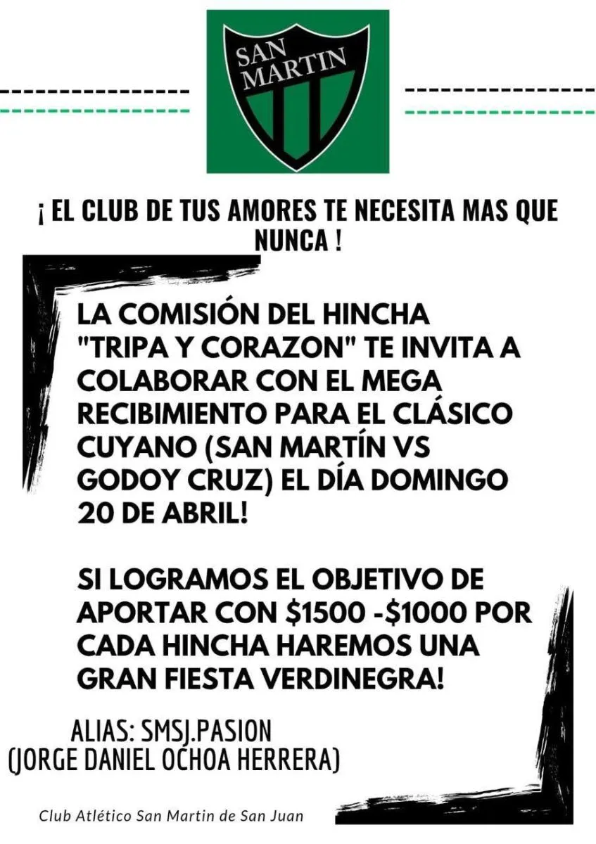 Sobre todo en redes sociales, desde que se conoció el fixture del actual certamen de la Superliga, los hinchas verdinegros apuntaron a este enfrentamiento. Si bien, el año pasado se dio en San Luis, por la Copa Argentina, ahora es diferente al disputarse en suelo sanjuanino. De ahí, la iniciativa que pide una colaboración económica por aportante entre $1.500 y $1.000 para "lograr una gran fiesta" tal se remarca en el flyer. Para los interesados, pueden colaborar al alias: sms.pasion. A su vez, la cuenta se encuentra a nombre de Jorge Daniel Ochoa Herrera.