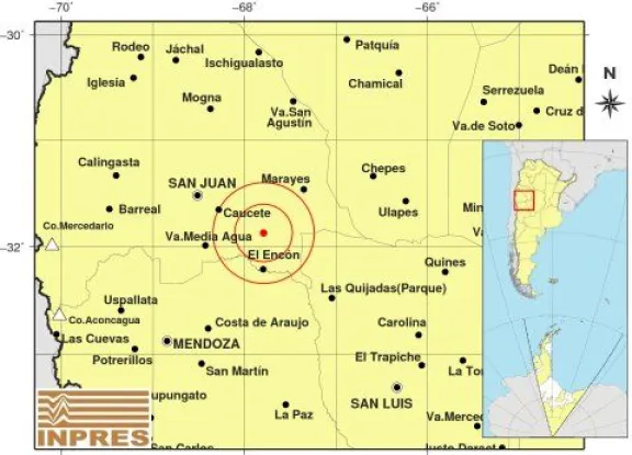 El epicentro del sismo fue 79 km al sureste de San Juan; 149 km al noreste de Mendoza y  35 km al sur de Bermejo.