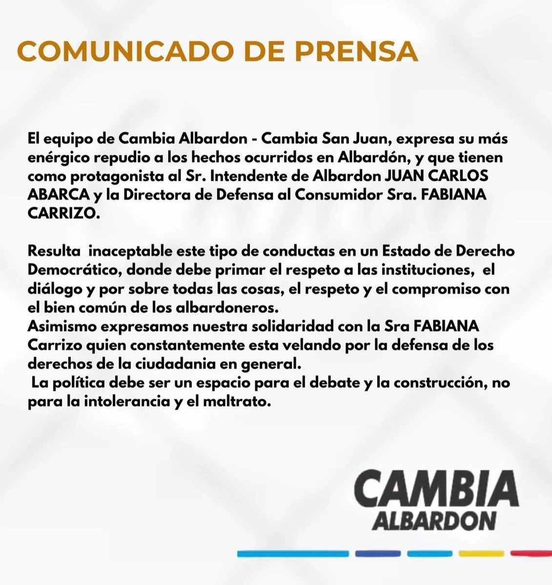 “El equipo de Cambia Albardón - Cambia San Juan, expresa su más enérgico repudio a los hechos ocurridos en Albardón, y que tienen como protagonista al Sr. Intendente de Albardón Juan Carlos Abarca y la directora de Defensa al Consumidor Sra. Fabiana Carrizo”, dice el comunicado.