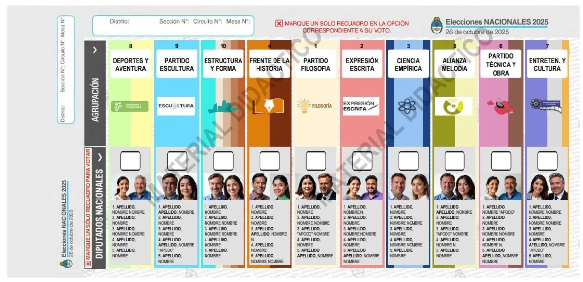 No fue lo único, ya que el máximo organismo nacional en materia electoral difundió ejemplos de Boleta Única. En la parte superior, estarán ubicadas las agrupaciones (alianzas o partidos), separadas en columnas, las que deberán poner su nombre, color y logotipo (sigla, monograma, escudo, símbolo, emblema o distintivo).