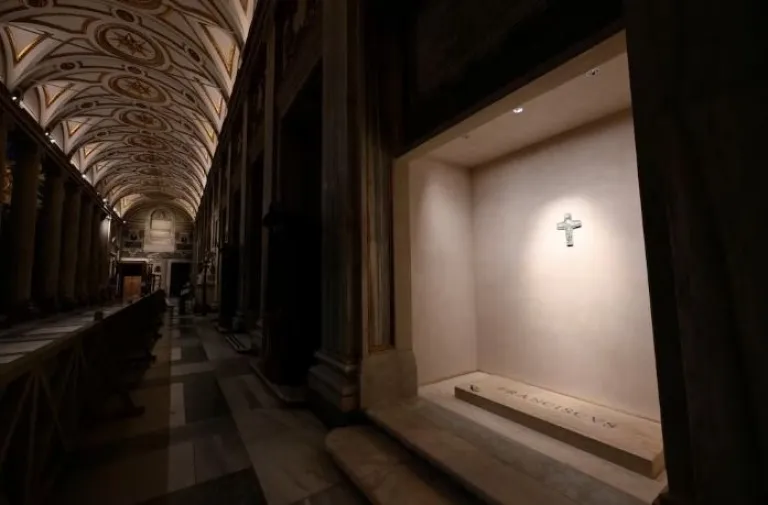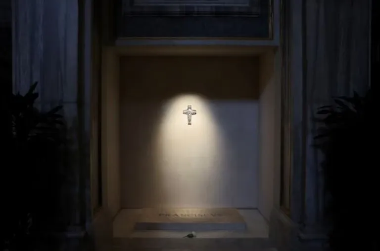 Ahora, en la penumbra dorada de Santa María la Mayor, los fieles se acercan a la tumba. Una rosa blanca descansa sobre el mármol, lanzando un suspiro perfumado en medio del murmullo de oraciones. Una tenue luz cálida baña la lápida y proyecta sombras suaves sobre la reproducción de la cruz pectoral que cuelga arriba, como si custodiara el sueño eterno de Francisco.