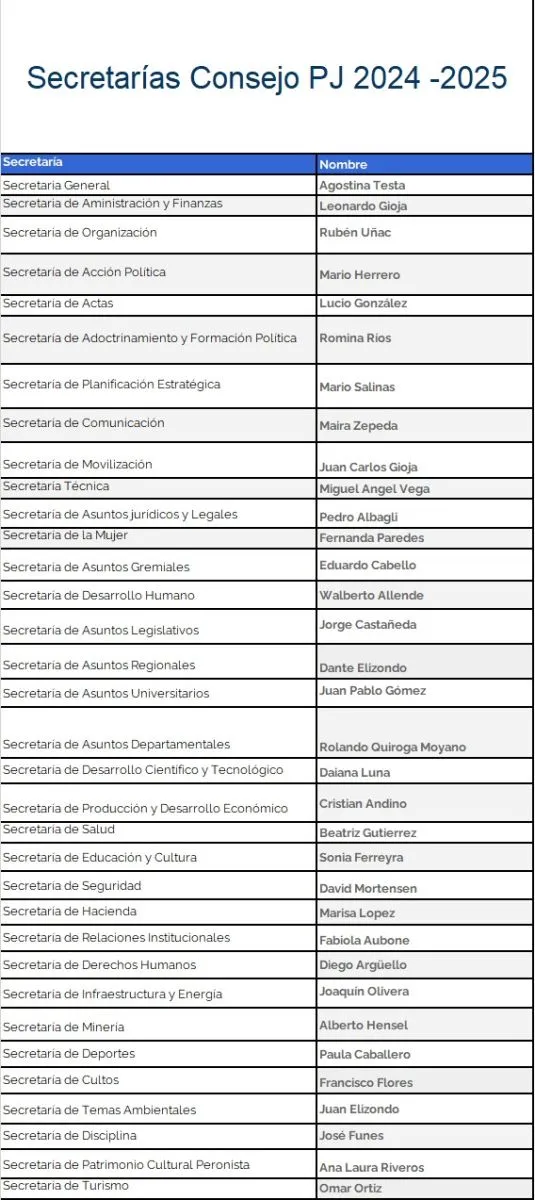 Mientras tanto, el PJ va cerrando sus organismos. En la unidad para la conducción de Quiroga Moyano y la vice Graciela Seva y su par Fabián Aballay, también se contuvo a Gramajo al otorgarle el “primer lugar” de los consejeros para Agostina Testa. El segundo lugar fue para Leonardo Gioja, ex diputado provincial. De esa manera, ambos ya tenían asegurados sus casilleros en la Secretaría General y la de Administración y Finanzas, respectivamente.
