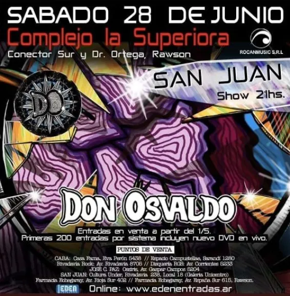 El grupo de rock Don Osvaldo vuelve a San Juan y tocará el 28 de junio en el Estadio Aldo Cantoni. Las entradas estarán a la venta desde el día 1 de mayo a través de la plataforma Edén Entradas.