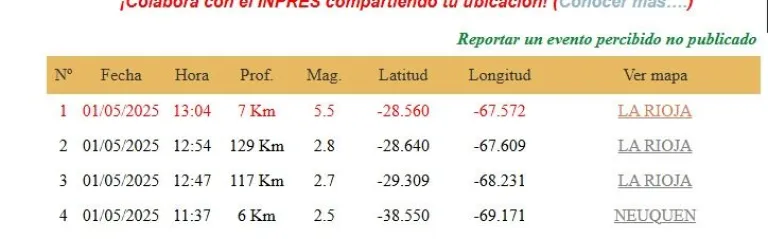 El temblor en La Rioja no fue el único que el Inpres registró este 1° de Mayo. También en Neuquén hubo uno de 2.5 de magnitud a 6 kilómetros de profundidad a las 11:37.