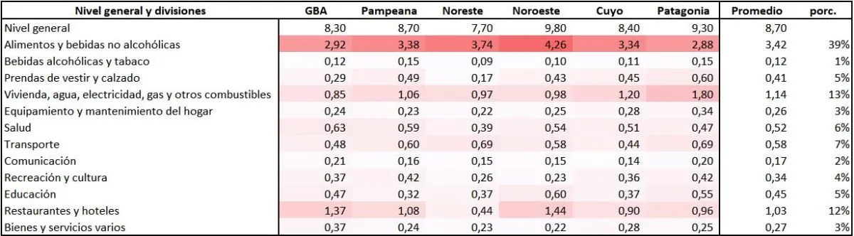 Sin embargo, cuando abrimos la cifra del IPC nacional nivel general, vemos que, durante este primer trimestre del año, los aumentos no fueron generalizados sino que sólo tres de las divisiones son responsables del 64% de la inflación en lo que va del año: Alimentos y bebidas (39%), Vivienda, agua, servicios (13%) y Restaurantes y hoteles (12%).