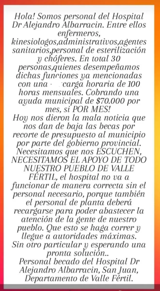 Según la información que trascendió, el municipio dejó sin trabajo a enfermeros, kinesiólogos, administrativos, agentes sanitarios, personal de esterilización y choferes, quienes cobran unos $70.000 por mes. “Hoy nos dieron la mala noticia que nos dan de baja las becas por recorte de presupuesto al municipio por parte del gobierno provincial”, indicaron en la imagen que se viralizó en las redes sociales.