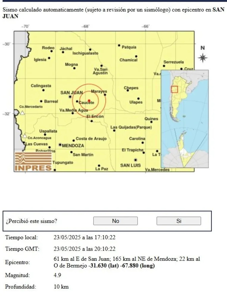 Cerca de las 17 horas, se produjo en San Juan un fuerte temblor de 4,9º de intensidad, de acuerdo a lo informado en su página web el Instituto Nacional de Prevención Sísmica (INPRES).