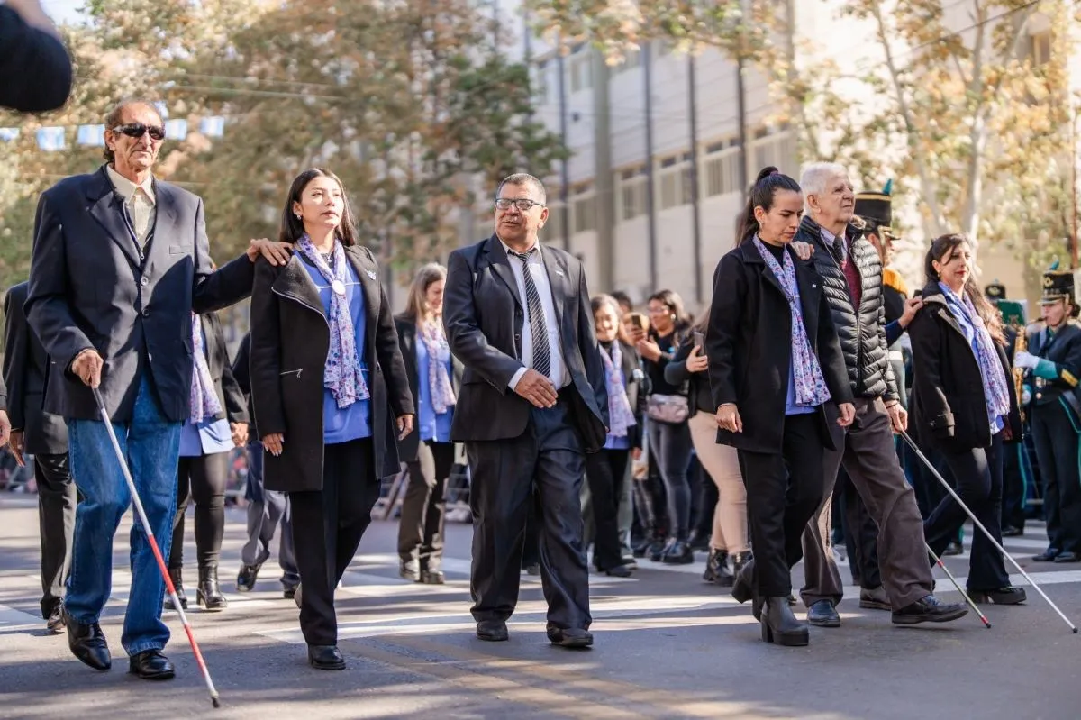 Escuelas, colegios privados, instituciones de Educación Especial y de formación profesional y docente, fueron los encargados de abrir el desfile ante una multitud de sanjuaninos que portaban banderas y colores celestes y blancos.