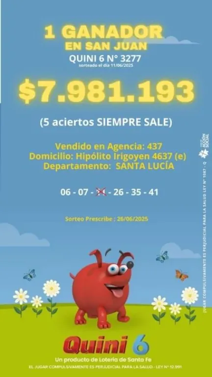 La apuesta ganadora fue realizada en una agencia ubicada en calle Hipólito Irigoyen 4637, en el departamento Santa Lucía. El jugador participó en la modalidad “Siempre Sale” y acertó cinco de los seis números seleccionados: 6, 7, 26, 35, 41 y 11 (este último no salió).