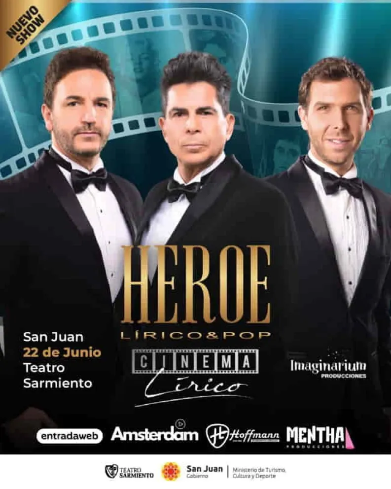 Héroe llegará a San Juan este 22 de junio, al Teatro Sarmiento, con su espectáculo Cinema Lírico, un show renovado en el que reinterpretan en estilo lírico-pop las canciones más emblemáticas del cine. “Fue una sorpresa enorme encontramos tanta gente disfrutando del lírico-pop. Este año venimos con un show totalmente nuevo, que estrenamos en abril y ya presentamos en Buenos Aires, Santa Fe y Córdoba. Las expectativas son muy altas, porque el público se va a encontrar con algo diferente”, adelantó Alejandro Falcone.