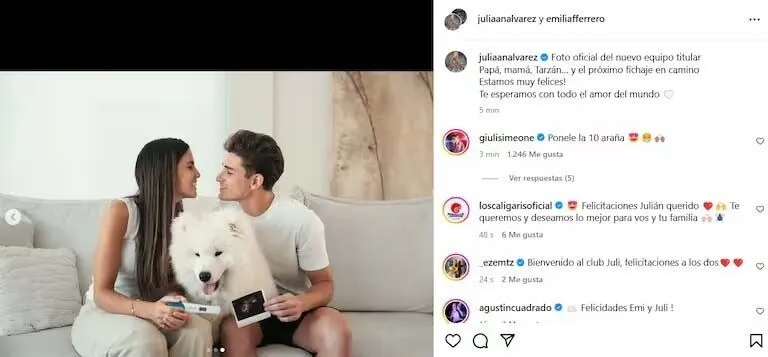 A través de su cuenta de Instagram, el ex River Plate hizo un emotivo posteo para comunicar la feliz noticia ante sus seguidores. “Foto oficial del nuevo equipo titular. Papá, mamá, Tarzán… y el próximo fichaje en camino. ¡Estamos muy felices! Te esperamos con todo el amor del mundo”, escribió el futbolista junto a unas postales con Emilia, su mascota y una foto de la ecografía del bebé.