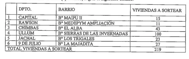Las viviendas disponibles no fueron adjudicadas en sorteos anteriores por incumplimientos o falta de documentación. Se encuentran en los departamentos de Capital, Rawson, Chimbas, Ullum, Jáchal y 9 de Julio.