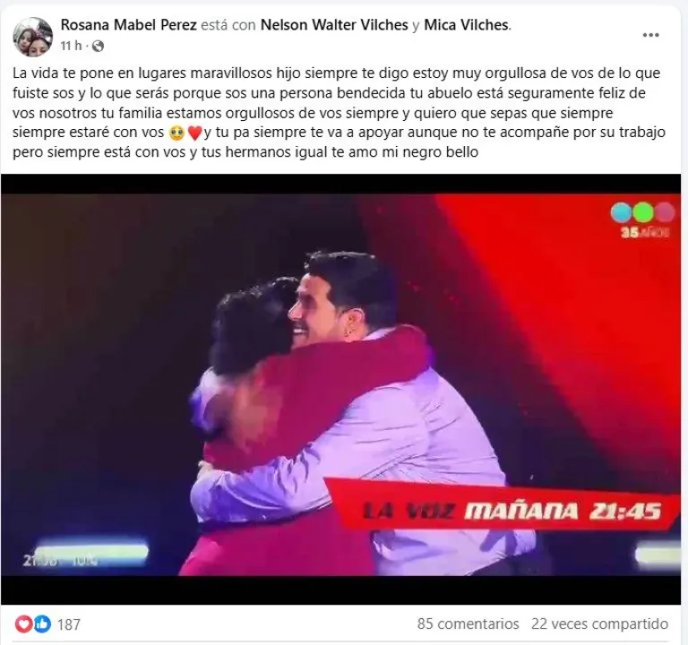 “La vida te pone en lugares maravillosos, hijo. Siempre te digo: estoy muy orgullosa de vos, de lo que fuiste, sos y serás, porque sos una persona bendecida. Tu abuelo seguramente está feliz de vos. Nosotros, tu familia, estamos orgullosos de vos siempre, y quiero que sepas que siempre, siempre estaré con vos ♥. Tu pa siempre te va a apoyar aunque no te acompañe por su trabajo, pero siempre está con vos, y tus hermanos igual. ¡Te amo, mi negro bello!”
