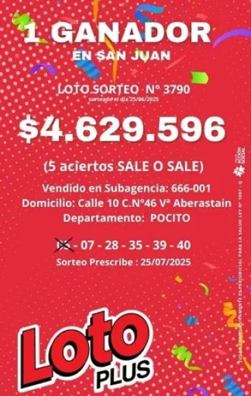 La fortuna llegó a San Juan con un premio millonario. Un pocitano se convirtió en uno de los ganadores del Loto Plus tras acertar cinco números en la modalidad “Sale o Sale”, embolsándose un total de $4.629.596.