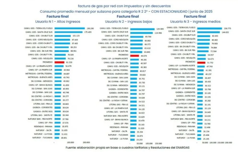 La factura promedio mensual de gas natural por redes para usuarios residenciales superó por primera vez los $50.000 a nivel nacional en junio de 2025, impulsada por los nuevos cuadros tarifarios sancionados ese mes, que actualizaron tanto el cargo fijo como el cargo variable. Los hogares de ingresos altos (usuarios N1) abonaron, en promedio, $61.220; los de ingresos medios (usuarios N3), $51.752; y los de ingresos bajos (usuarios N2), $46.674, según un informe publicados por el Observatorio de Tarifas y Subsidios IIEP (UBA - Conicet). De acuerdo a este estudio, San Juan se encuentra por debajo de la media nacional.
