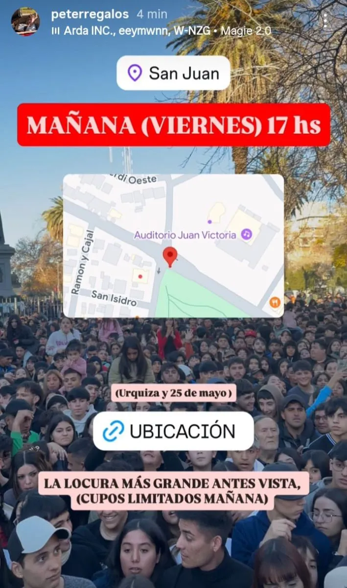 Pedro Casarino, más conocido como Peter Regalo, no se da por vencido. Tras la negativa de la Policía de San Juan a la convocatoria espontánea que había generado revuelo en redes este miércoles, el joven influencer anunció una nueva ubicación para reencontrarse con sus seguidores: será este viernes a las 17 horas en calle Urquiza y 25 de Mayo, en las inmediaciones del Auditorio Juan Victoria.