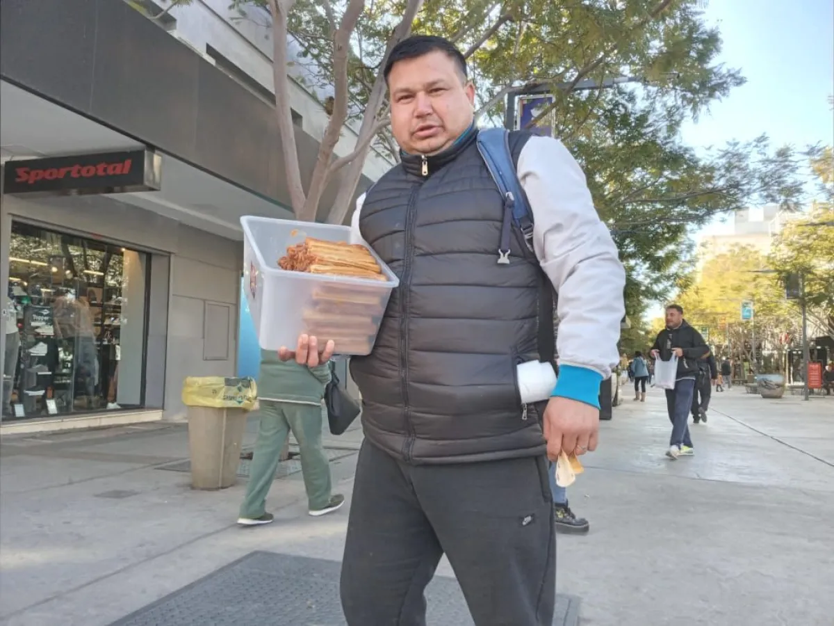 Los churreros no siempre son locales. También llegan trabajadores de otras provincias. Ese es el caso de Pablo Molina, que fue invitado a probar suerte en San Juan. El hincha de Belgrano dejó la Docta y desde hace cuatro meses recorre la peatonal con un táper en el brazo derecho.
