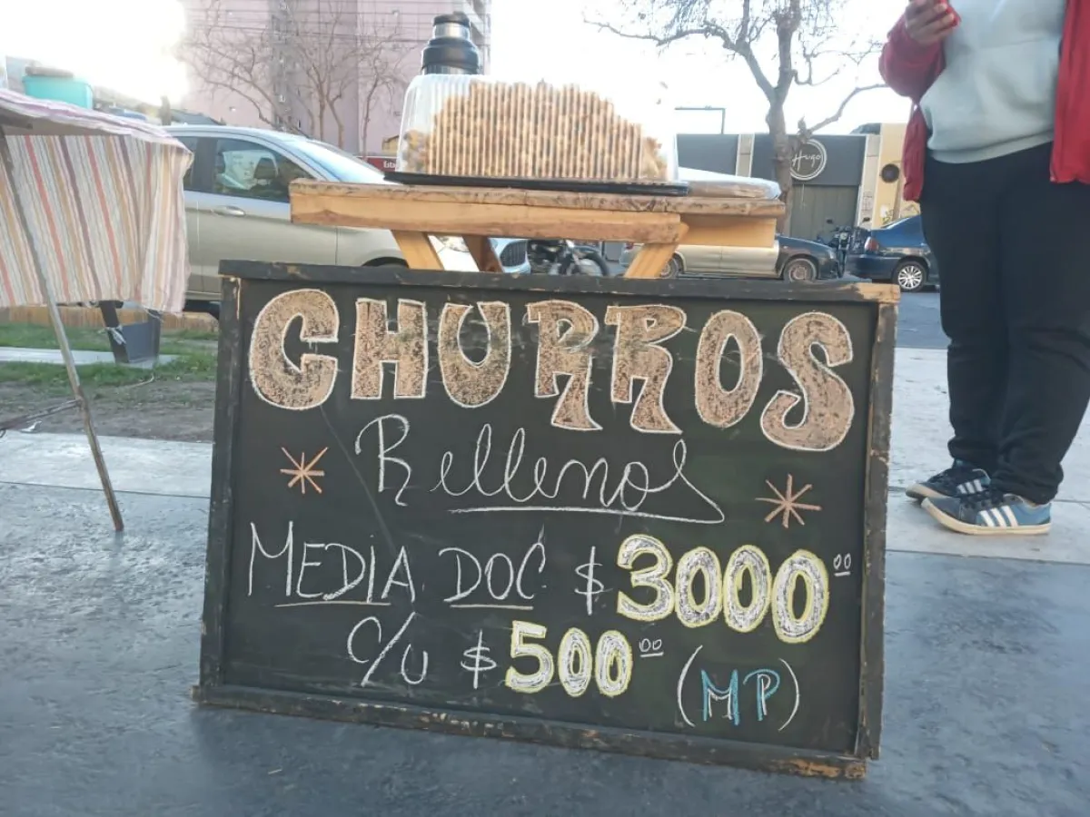 Cada mañana van hasta la casa de un amigo a buscar la mercadería. Actualmente compran 20 docenas para dividirse entre los dos, con un detalle de marketing que quedó registrado en los carteles con los que hacen las promociones: Luz tiene cada churro a $500, mientras que Ezequiel los ofrece a $600. Pero los dos venden la media docena a $3000 y la docena a $6000.