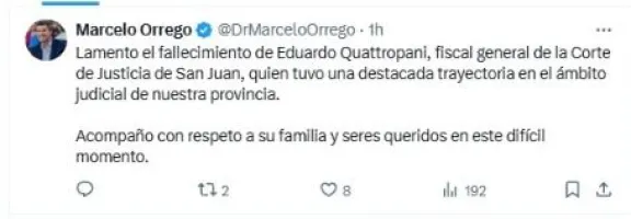 Lamento el fallecimiento de Eduardo Quattropani, fiscal general de la Corte de Justicia de San Juan, quien tuvo una destacada trayectoria en el ámbito judicial de nuestra provincia. Acompaño con respeto a su familia y seres queridos en este difícil momento”, escribió Orrego en la red social de Twitter.