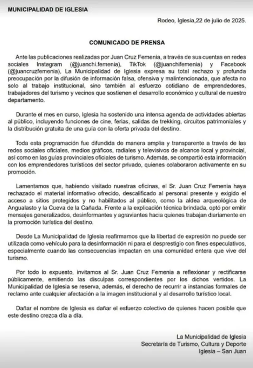 Juan Cruz Femenía es un influencer que dedica buena parte de sus contenidos a la difusión de sitios turísticos de la provincia. Uno de los últimos fue Iglesia y el sanjuanino tuvo duras críticas al personal de Turismo de aquella comuna lo que le valió que las autoridades difundieran un comunicado tildándo sus dichos de “ofensivos y malintencionados”. Además, pidieron una disculpa pública. Femenía primero dijo que no iba a hacerlo, se disculpó de manera tibia y más tarde realizó otro.