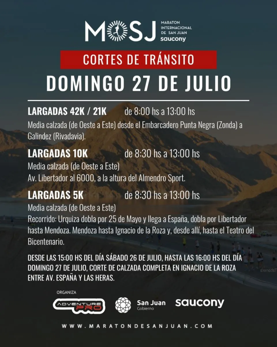 Este domingo 27 de julio, se correrá una nueva edición de la Maratón Internacional de San Juan, que convocará a cientos de corredores en sus versiones de 42K, 21K, 10K y 5K. La competencia implicará cortes de tránsito parciales y totales en distintos puntos clave del Gran San Juan.
