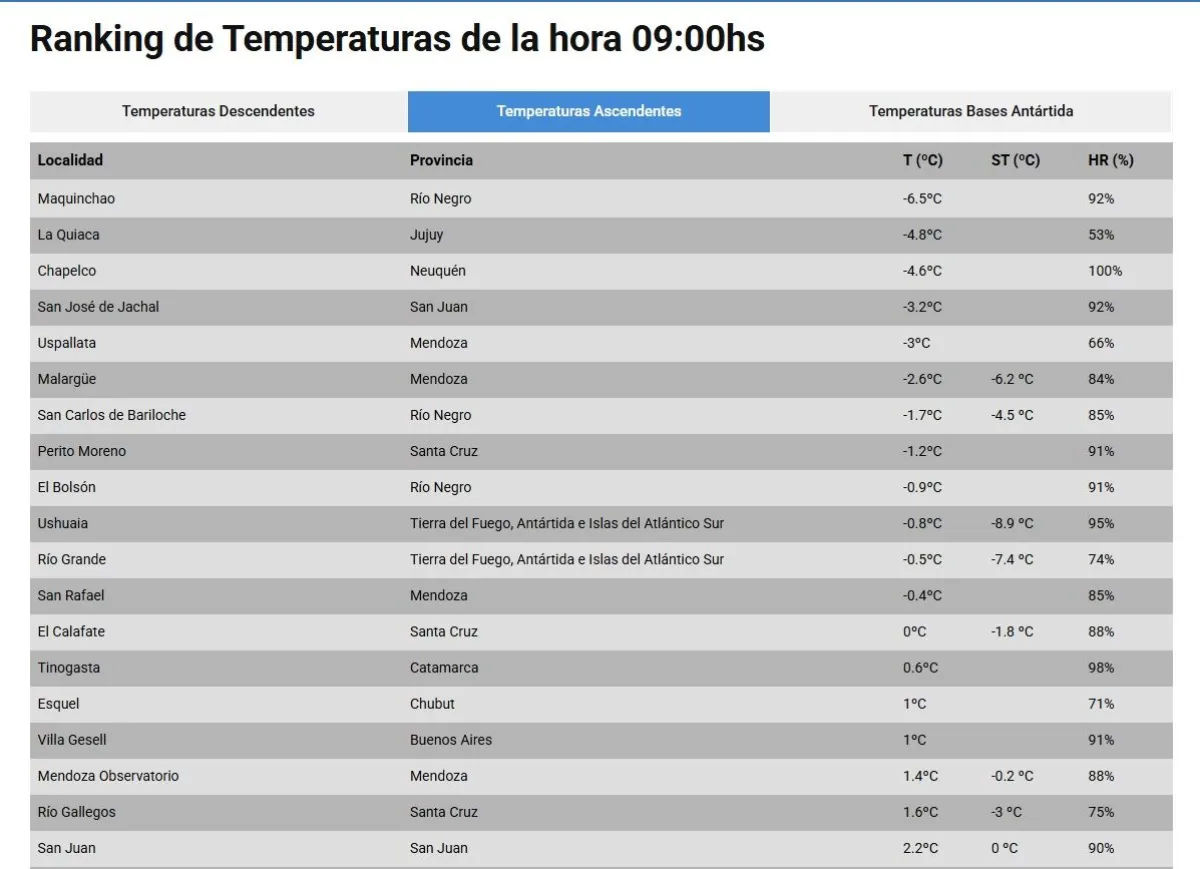 A las 9 de la mañana, Jáchal registraba -3.2° (bajo cero) siendo cuarta en el conteo y solo superada Maquinchao, en Río Negro (-6.5°), La Quiaca, en Jujuy (-4.8°) y Chapelco, en Neuquén (-4.6°). El top 5 lo completó Uspallata, en Mendoza (-3°).