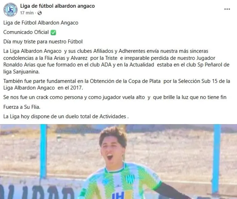 Por lo sucedido, desde la Liga Albardon-Angaco y sus clubes Afiliados, enviaron sus condolencias a la familia. “Se nos fue un crack como persona y como jugador. Vuela alto y que brille la luz que no tiene fin”, expresaron.