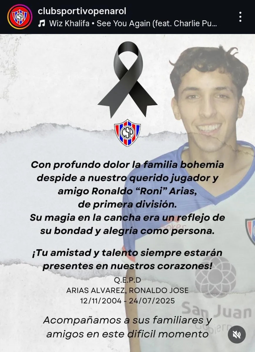 Ante semejante tragedia, el mundo del fútbol doméstico mostró todo su dolor. El propio club de Arias, Peñarol hizo un posteo para decirle adiós: "Con profundo dolor, la familia bohemia despide a nuestro jugador y querido amigo Ronaldo 'Roni' Arias, de primera división. Su magia en la cancha era un reflejo de su bondad y alegría como persona", expresa el posteo y agrega "¡Tu amistad y talento siempre estarán presentes en nuestros corazones!".