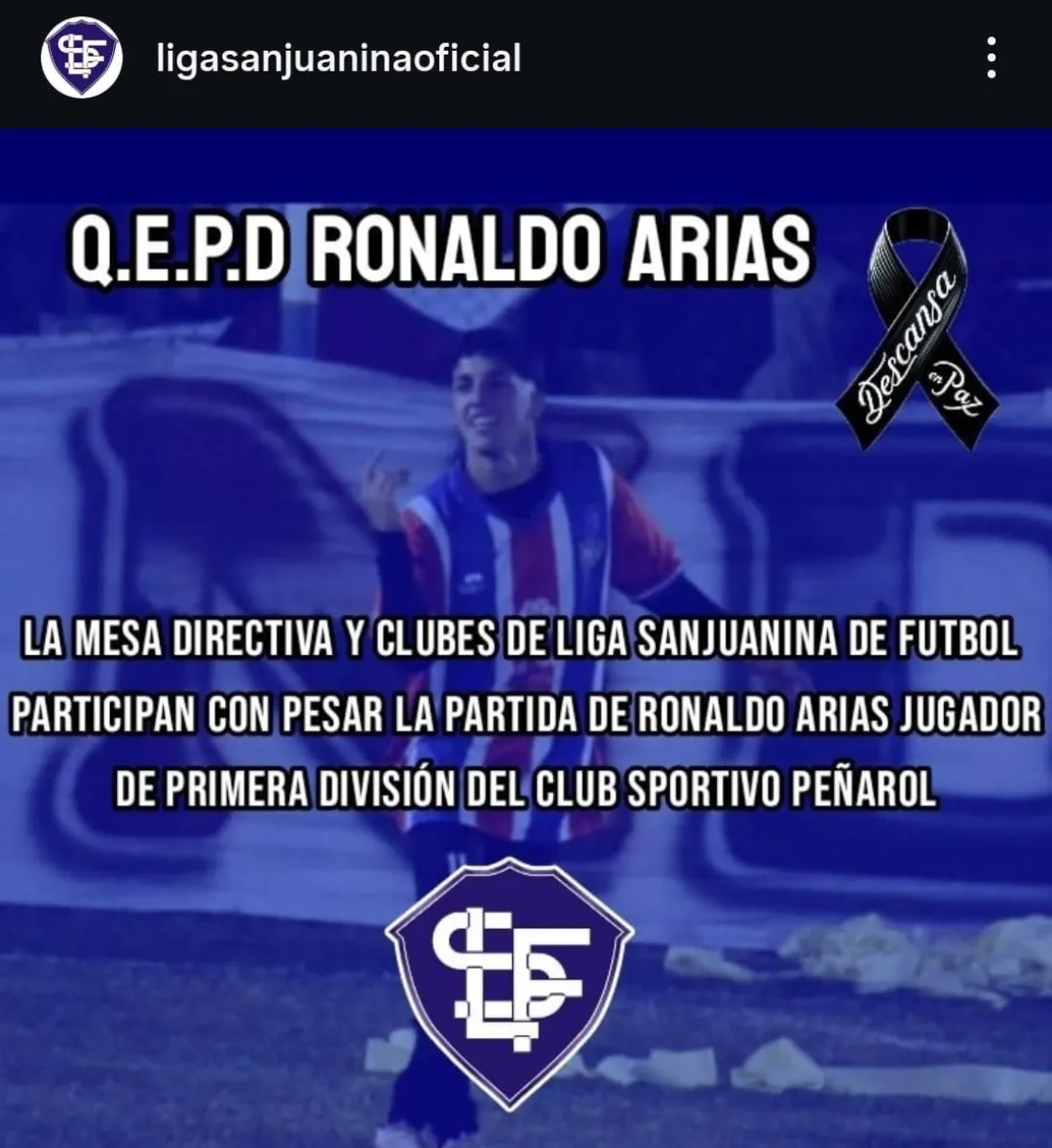 Por su lado, la Liga Sanjuanina de Fútbol expresó en sus redes sociales que "la mesa directiva y clubes de esta institución, participan con pesar la partida de Ronaldo Arias, jugador de Primera División del Club Sportivo Peñarol".
