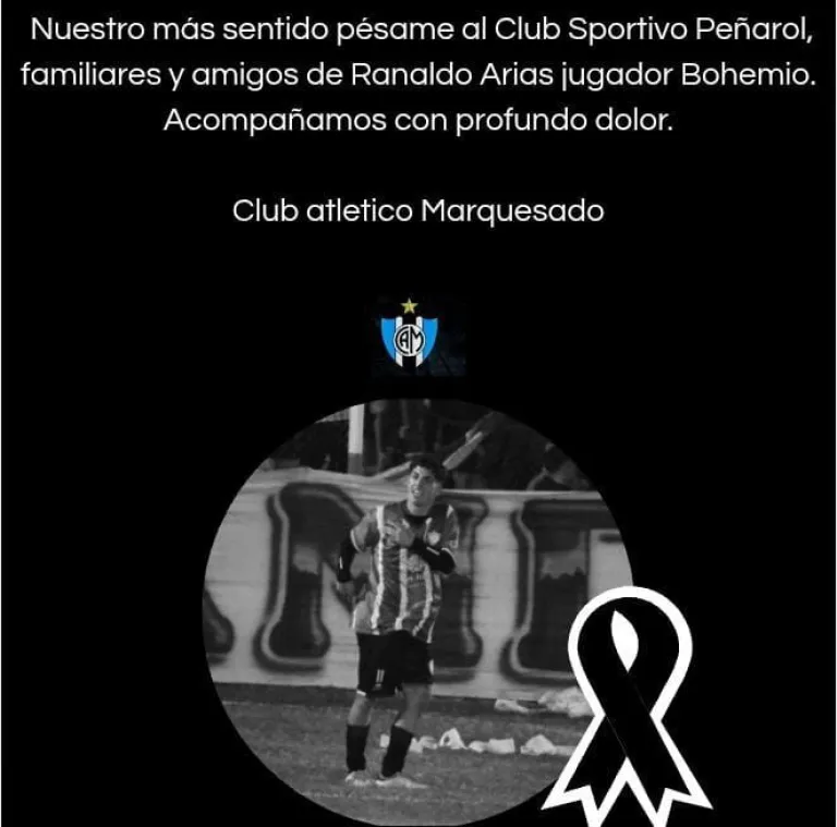 Por su lado, el Club Marquesado destacó que "nuestro más sentido pésame al Club Sportivo Peñarol, familiares y amigos de Ronaldo Arias, jugador bohemio. Acompañamos con profundo dolor".
