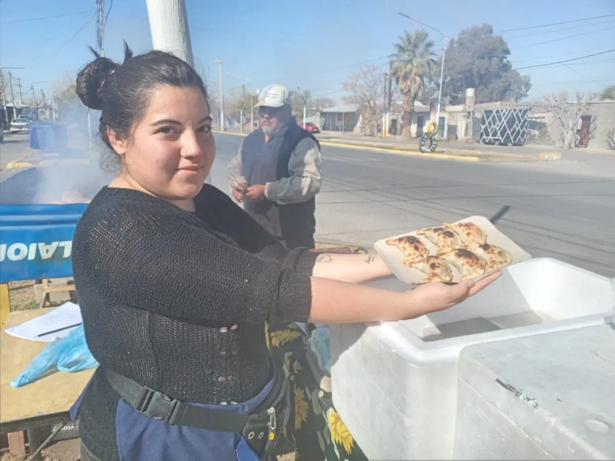 Frente a la escuela Arturo Illia, por Benavídez, Antonella ofrece empanadas de carne y pollo. “Mi esposo vende en Calívar y Benavídez hace como seis años. Yo empecé acá hace cinco meses”. La mujer no conseguía trabajo y decidió salir a la calle para ayudar a la economía familiar. Su esposo trabaja durante la semana en la Municipalidad de Chimbas, pero el costo de vida se elevó y para muchos ya no hay descanso. Cuando tienen un buen fin de semana, entre los dos venden 48 docenas.
