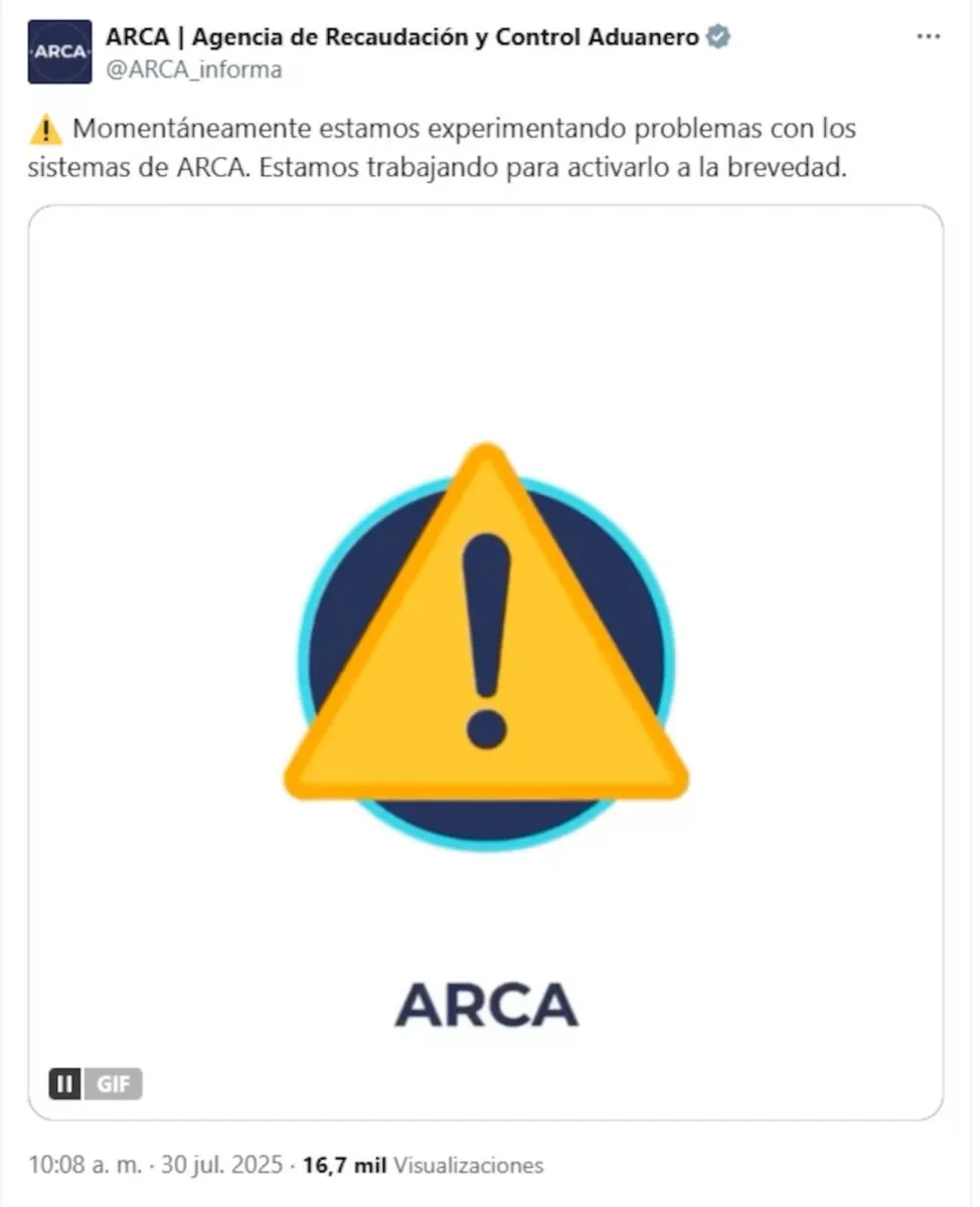 Desde la cuenta oficial de ARCA en X, el organismo publicó un mensaje para llevar algo de tranquilidad: “Momentáneamente, estamos experimentando problemas con los sistemas de ARCA. Estamos trabajando para activarlo a la brevedad”.