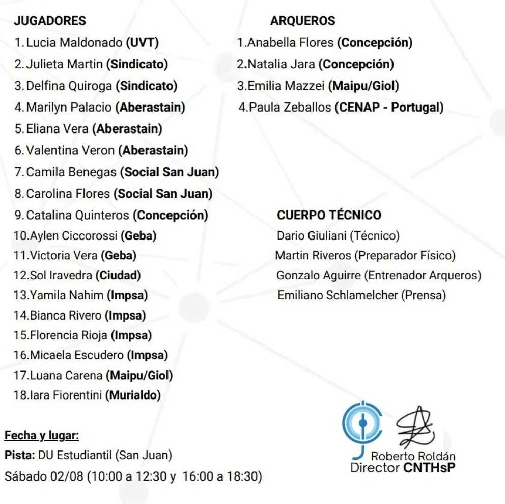 Se trata del llamado a hockistas que militan tanto en nuestra provincia, como Mendoza y Buenos Aires. Según se informó oficialmente desde la CAP, Giuliani convocó a 18 jugadoras de campo y 4 arqueras. A su vez, se destaca que, por ahora, el DT campeón con Las Águilas en San Juan hace tres años, no cuenta con ayudante de campo.