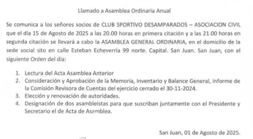 La espera terminó en Puyuta. Este viernes se confirmó que el próximo 15 de agosto se llevará a cabo la Asamblea en Sportivo Desamparados, donde los socios podrán elegir nuevas autoridades y cerrar un extenso período de incertidumbre dirigencial.