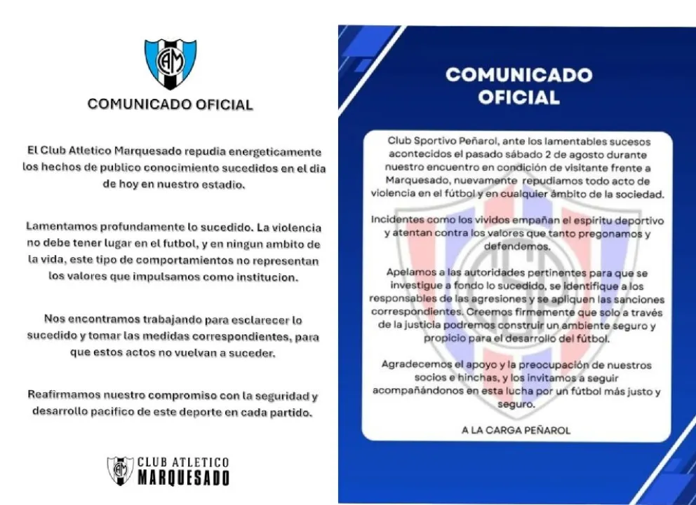 Desde Marquesado, que hacía de local, pidieron disculpas públicas a todas las partes involucradas y aseguraron que tomarán medidas contra los responsables. Peñarol también se expresó de manera oficial y repudió lo sucedido.