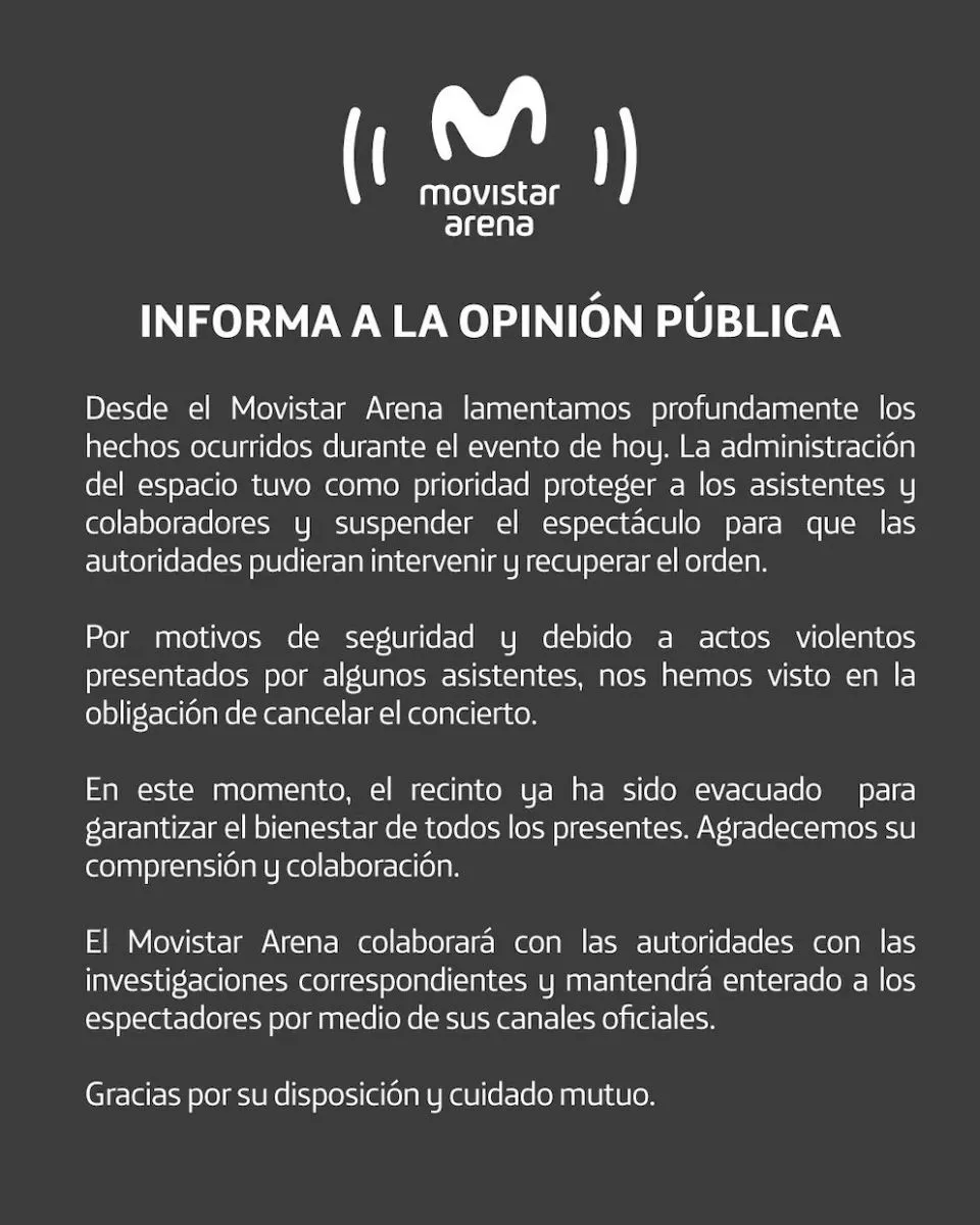 Poco después de los disturbios y el desenlace fatal, la administración del Movistar Arena dio a conocer su posición mediante un comunicado oficial.