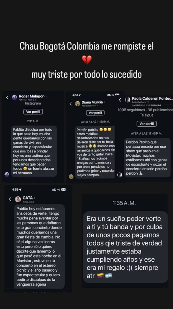 Uno de los mensajes compartidos por Lescano destacó: “No se pudo hoy, nunca imaginé terminar así el día”, además de manifestar su tristeza y ofrecer disculpas por no haber logrado que el show se lleve a cabo. Otro mensaje señaló que mucha gente compró su entrada y lamentó que el evento no se haya realizado, al agregar que los colombianos siempre esperan con ansias el regreso de Lescano. Otra usuaria también manifestó su pesar por la situación, al indicar que “por culpa de otras personas irresponsables” los verdaderos fans se quedaron con la ilusión de ver la banda.