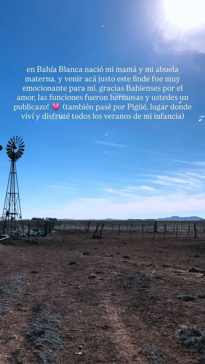 El martes 25 de agosto y luego de su última presentación en Bahía Blanca, Gimena Accardi compartió en Instagram una imagen del paisaje pampeano y se mostró profundamente movilizada por lo que significó el viaje. “En Bahía Blanca nació mi mamá y mi abuela materna. Venir acá justo este finde fue muy emocionante para mí. Gracias bahieneses por el amor, las funciones fueron hermosas y ustedes un publicazo”, escribió en una historia acompañada de un corazón.