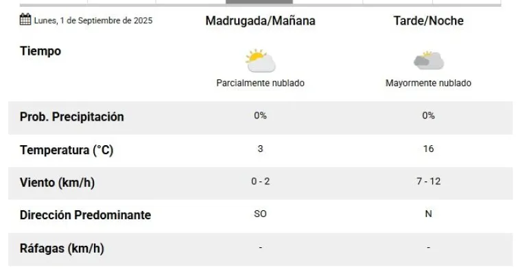 Para el lunes, inicio de septiembre, no se esperan precipitaciones, pero las máximas no superarán los 16°.