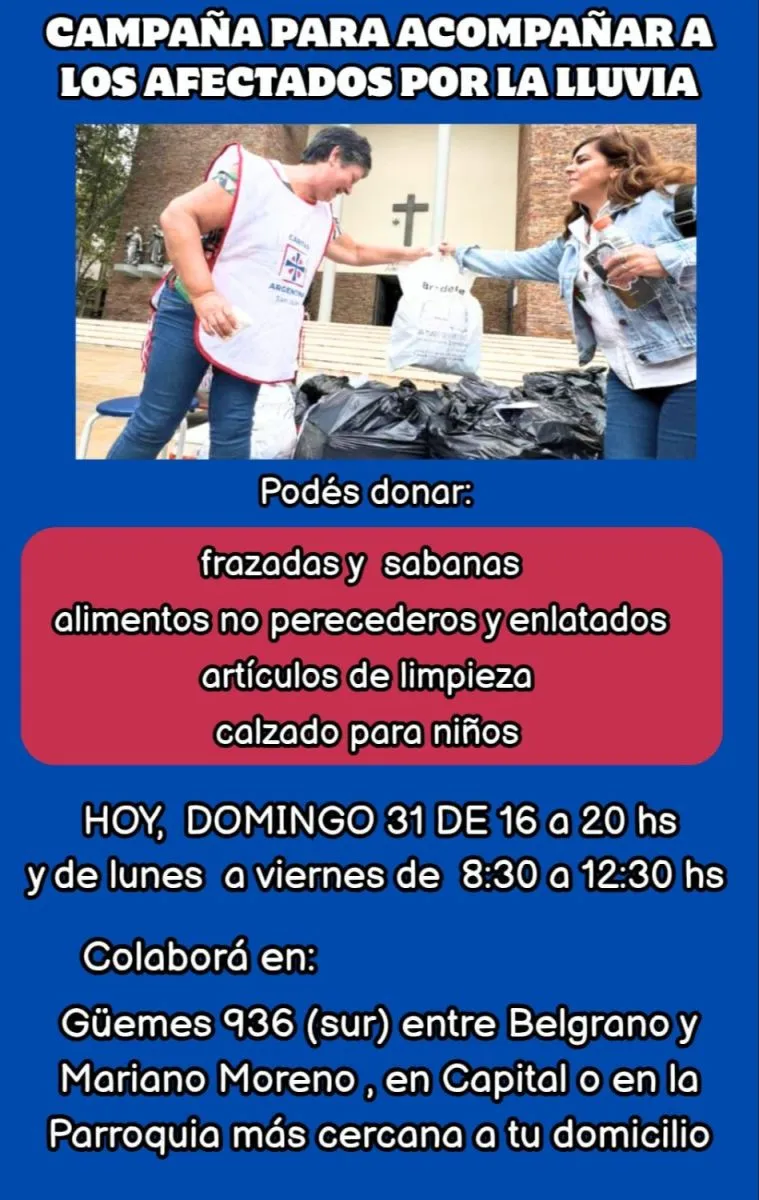 Las donaciones pueden entregarse este domingo 31 de agosto, de 16 a 20 horas, y de lunes a viernes de 8.30 a 12.30 horas. Los puntos de recepción habilitados son la sede de Cáritas, ubicada en Güemes 936 (sur), entre Belgrano y Mariano Moreno, en Capital, o en la parroquia más cercana al domicilio del donante.